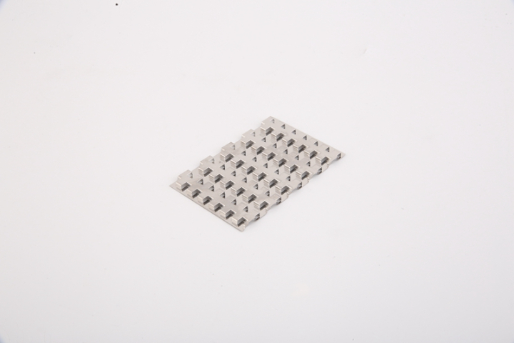 本發(fā)明的有益效果:本發(fā)明通過在翅片的切斷處設(shè)置長條形橋片,當(dāng)對(duì)翅片進(jìn)行切斷時(shí),不會(huì)切到長條形橋片上,保證翅片切斷時(shí)不會(huì)變形,提高翅片的合格性。所述模具結(jié)構(gòu),能夠在成型橋片單元和第二橋片單元間進(jìn)行切換,從而獲得兩種橋片單元的翅片結(jié)構(gòu)。且能夠?qū)崿F(xiàn)連續(xù)化的加工,不會(huì)影響翅片的加工效率。以下將結(jié)合附圖和實(shí)施例,對(duì)本發(fā)明進(jìn)行較為詳細(xì)的說明。附圖說明圖1為現(xiàn)有翅片的結(jié)構(gòu)示意圖。圖2為本發(fā)明兩個(gè)雙橋翅片切斷前的結(jié)構(gòu)示意圖。圖3為本發(fā)明中雙橋翅片模具的縱向剖視圖。圖4為本發(fā)明中雙橋翅片模具的橫向局部剖視圖。圖5為圖4中a的局部放大圖。圖6為本發(fā)明中上斜鍥和下斜鍥的結(jié)構(gòu)示意圖。圖7為本發(fā)明中橋片凸模和第二橋片凸模在下子模板上的分布示意圖。具體實(shí)施方式實(shí)施例,如圖2所示,一種雙橋翅片結(jié)構(gòu),包括至少一列翅片單元1,本實(shí)施例中的雙橋翅片結(jié)構(gòu)并排設(shè)置有4列翅片單元1。每列翅片單元1上分布有一組脹桿安裝孔2,脹桿安裝孔2沿翅片的長度方向等距離分布,相鄰兩脹桿安裝孔2的距離為翅片在級(jí)進(jìn)模上前行一次的小距離,即為一個(gè)步距。每列翅片單元1上位于脹桿安裝孔2的兩側(cè)設(shè)置有橋片單元3或第二橋片單元4。銅折疊翅片廠家-常州三千科技。