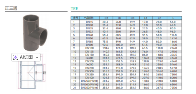 PVC與CPVC管件正三通:在流體輸送管道系統(tǒng)中,管件作為連接、分流與調(diào)控的**組件,其材質(zhì)與結(jié)構(gòu)設(shè)計直接影響著整個系統(tǒng)的穩(wěn)定性、耐腐蝕性與適用場景。正三通作為一種常見的分支管件,憑借“T”或“Y”形結(jié)構(gòu)實現(xiàn)流體的分流或合流,廣泛應(yīng)用于化工業(yè)場景。其中,PVC(聚氯乙烯)與CPVC(氯化聚氯乙烯)材質(zhì)的正三通因具備優(yōu)良的耐腐蝕性、加工性能與成本優(yōu)勢,成為市場主流選擇。PVC是通過氯乙烯單體聚合而成的高分子材料,分為硬質(zhì)PVC(UPVC)與軟質(zhì)PVC兩類,正三通通常采用硬質(zhì)PVC。其**特性包括: **耐腐蝕性**:對酸、堿、鹽等常見腐蝕性介質(zhì)具有優(yōu)異抵抗能力,適用于一般化工、給排水場景; **加工性能**:易于通過注塑、擠出等工藝成型,可生產(chǎn)等徑、異徑等多種規(guī)格的三通管件;- **成本優(yōu)勢**:原材料價格相對較低,加工能耗小,整體成本較CPVC更具競爭力; **溫度限制**:長期使用溫度一般不超過60℃,高溫環(huán)境下易出現(xiàn)軟化變形,機械強度下降。UPVC與CPVC管件直通長期使用溫度范圍為-10℃至60℃。